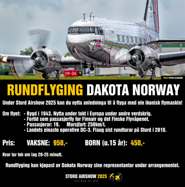 Annonseringane til flyprogrammet tar fri denne veka, men me har fleire godbitar på lur etter påske! Før me tar påskeferie, minner me om denne unike anledninga til å vera med på rundflyging i ein ekte warbird under Stord Airshow! Billettar til Stord Airshow finn du under «Billettar».
