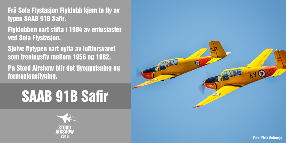 mai22201822. mai 2018Meir informasjonModellfly deltager1. juni 2018Propell- og jetfly i frå Haugaland Modellflyklubb.30. mai 2018Bergen Aero Klubb melder forfall på sin Super Decathlon.23. mai 2018To SAAB 91B Safir frå Sola Flystasjon Flyklubb14. mai 2018T-6 Harvard returnerer til Stord11. mai 2018T-6 Harvard11. mai 2018